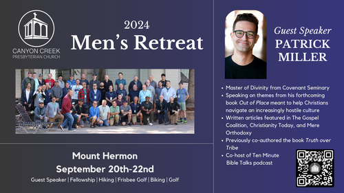 Men of Canyon Creek, save the date for our annual Men's Retreat! We will be going to Mount Hermon this year on the weekend of September 20th-22nd. Our guest speaker is Patrick Miller who will be speaking on topics and themes from his forthcoming book Out of Place meant to help Christians navigate the increasingly hostile culture by guiding them through Biblical postures and practices. There will be plenty of free time for fellowship, hiking, golfing, biking, and frisbee golf. It will be a great weekend to strengthen our faiths and the bond of fellowship we share with one another. Early Bird registration will open soon.